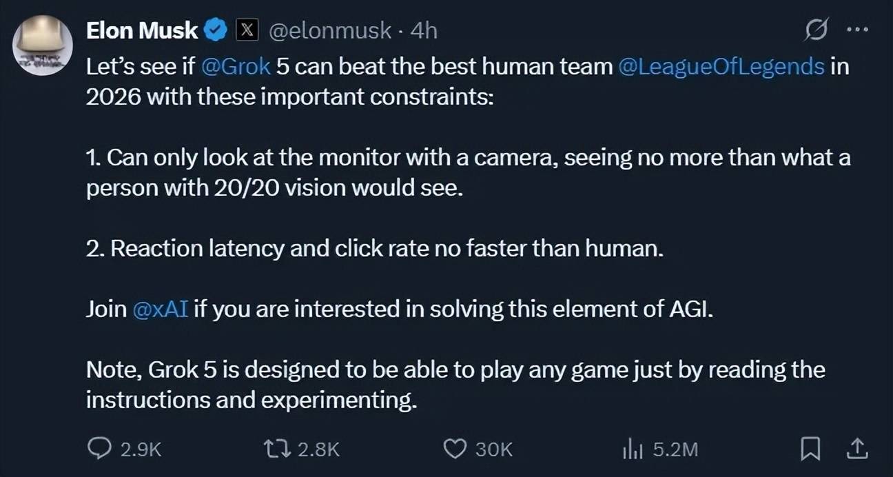 这位整活达人宣布,他将会以他旗下人工智能公司xAI的产品Grok5组成“AI战队”,挑战《英雄联盟》明年的S16世界冠军。